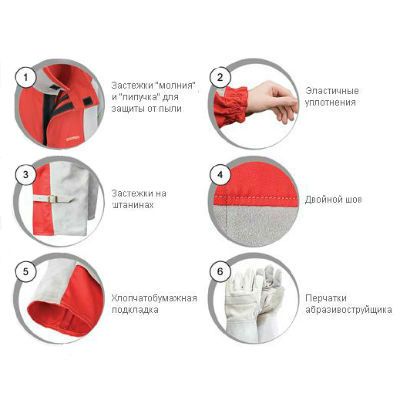 Костюм оснащен двойной застёжкой "молния", застежками "липучка" на брючинах и эластичными резинками на рукавах для защиты от попадания пыли и абразива под одежду.
